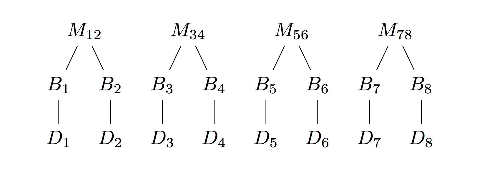 We have multiple trees now. Interestingly, we have exactly trees pending at a time. Again our longer trees take up an extra layer than traditional binary trees, so in this case nodes since we have leaves, and we have of these trees.