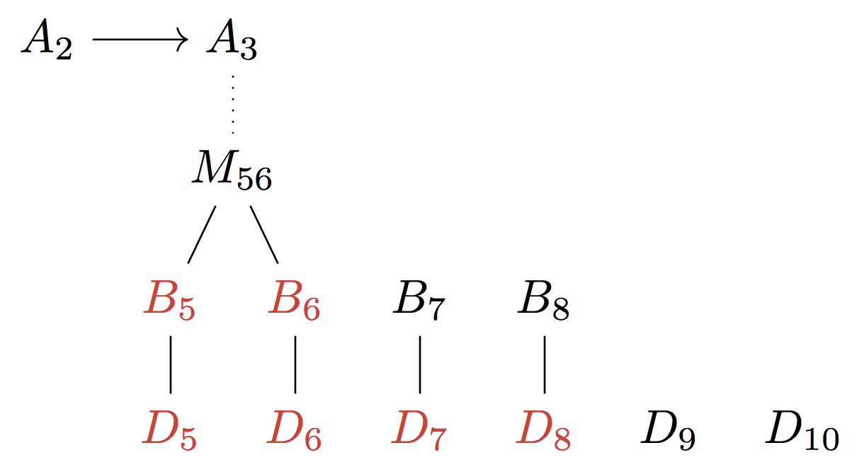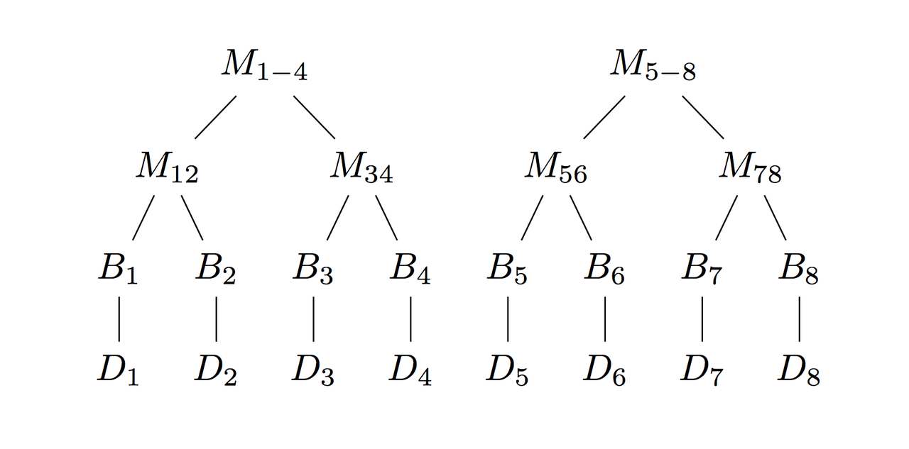 Notice that we only use some of each layer of trees even across the trees. And so we can represent the frontier of the trees with only a single tree representing the work pipeline moving from leaves to the root in the following manner: